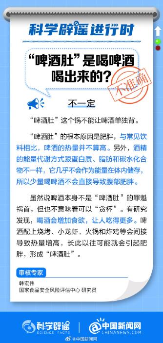 中新網7月18日電 “啤酒肚”的根本原因是肥胖,與常見飲料相比,啤酒的熱量并不算高。另外,酒精的能量代謝方式跟蛋白質、脂肪和碳水化合物不一樣,它幾乎不會作為能量在體內儲存,所以少量喝啤酒不會直接導致腹部肥胖。雖說啤酒本身不是“啤酒肚”的罪魁禍首,但也不意味著可以“貪杯”。(來源:科學辟謠、中國新聞網)