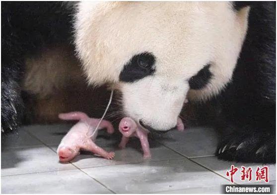 當地時間2023年7月7日,大熊貓“愛寶”在韓國三星愛寶樂園產下雙胞胎幼崽。圖為“愛寶”與幼崽。 (韓國三星愛寶樂園供圖)