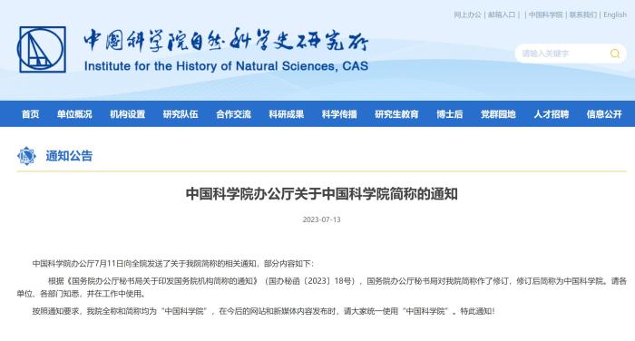 據中國科學院自然科學史研究所網站發布的消息,中國科學院辦公廳7月11日發布了關于中國科學院簡稱的相關通知,部分內容如下: