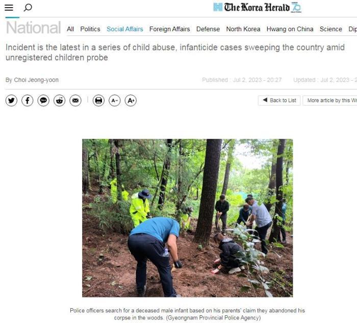 2023年7月2日,韓國慶尚南道警方稱,已向一名20多歲的男子和一名30多歲的女子發出逮捕令,原因是他們勒死了自己的孩子,并將尸體丟棄在慶尚南道巨濟附近的一條河里。