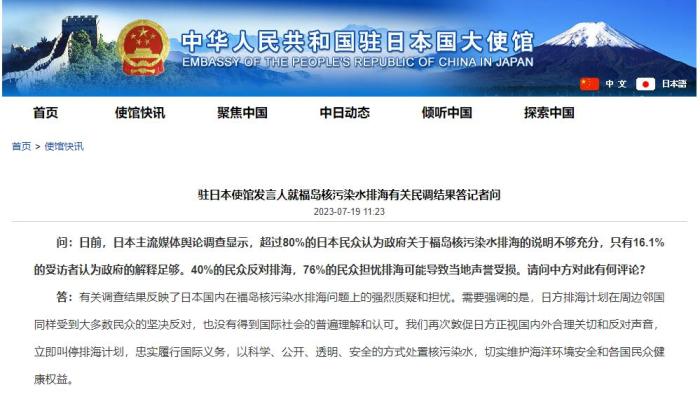 中新網7月19日電 據中國駐日本大使館網站消息,中國駐日本使館發言人就福島核污染水排海有關民調結果答記者問時表示,日方排海計劃在周邊鄰國同樣受到大多數民眾的堅決反對,也沒有得到國際社會的普遍理解和認可;再次敦促日方正視國內外合理關切和反對聲音,立即叫停排海計劃。