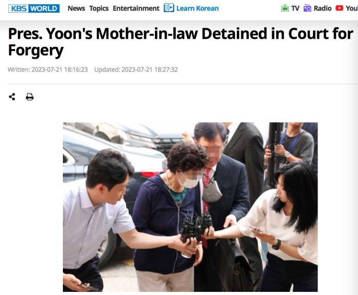 韓聯社指出,現任總統的岳母當庭被捕,在韓國憲政史上尚屬首次。