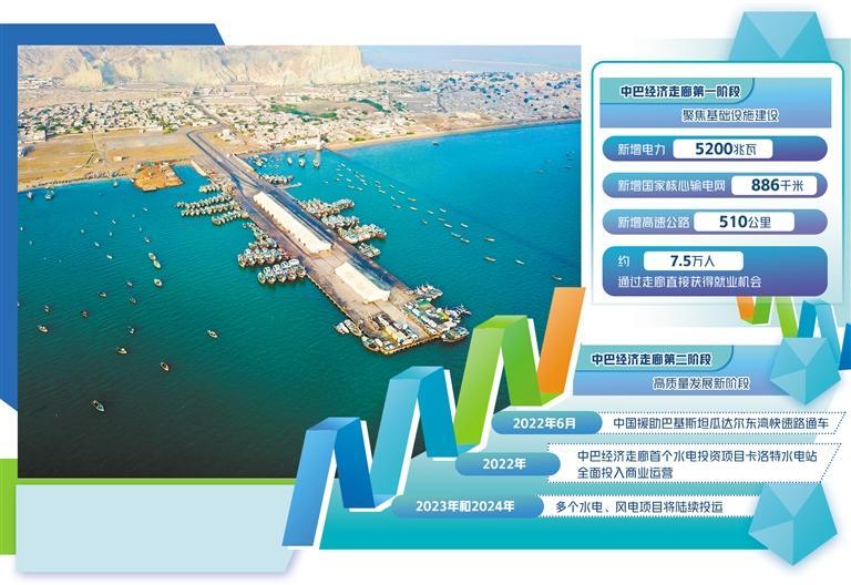 當前正處于中巴經(jīng)濟走廊建設(shè)的第二階段,這也是至關(guān)重要的高質(zhì)量發(fā)展新階段。中巴雙方在走廊框架下,進一步加強巴國工業(yè)化進程、人力資源培訓(xùn)和產(chǎn)業(yè)園區(qū)建設(shè),在扶貧、醫(yī)療、農(nóng)業(yè)以及互聯(lián)網(wǎng)等眾多與民生息息相關(guān)的領(lǐng)域持續(xù)深化合作,力求創(chuàng)造更多就業(yè)機會,不斷推動巴基斯坦的經(jīng)濟和社會現(xiàn)代化發(fā)展,造福當?shù)孛癖姟?022年6月,中國援助巴基斯坦瓜達爾東灣快速路通車,打通了瓜達爾港和卡拉奇之間的交通運輸通道。同年,中巴經(jīng)濟走廊首個水電投資項目——卡洛特水電站全面投入商業(yè)運營,每年將向巴基斯坦提供32億千瓦時廉價清潔電能,滿足當?shù)?00萬人用電需求,每年可節(jié)約標準煤約140萬噸,減少二氧化碳排放350萬噸。今明兩年,走廊框架下的多個水電、風電項目將陸續(xù)投運,未來巴基斯坦在清潔能源領(lǐng)域大有可為。