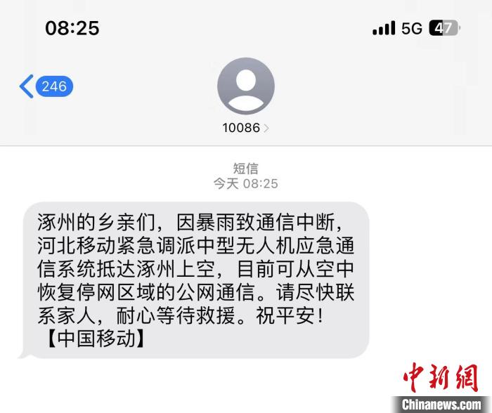中新網石家莊8月3日電 (郝燁 趙景科)“【中國移動】涿州的鄉親們,因暴雨致通信中斷,河北移動緊急調派中型無人機應急通信系統抵達涿州上空,目前可從空中恢復停網區域的公網通信。請盡快聯系家人,耐心等待救援。祝平安!”8月3日早,河北涿州災區的群眾收到一條來自空中的短信。