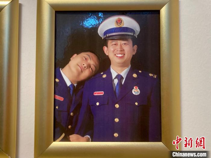 圖為北京市海淀區北安河消防救援站“笑臉墻”上,馮振(右)和戰友2021年的合照。 中新社記者 徐婧 攝