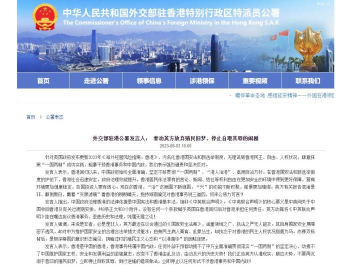 中新網(wǎng)8月3日電 據(jù)外交部駐港公署網(wǎng)站消息,針對英國政府發(fā)布更新2023年《海外經(jīng)營風(fēng)險指南:香港》,污名化香港國安法和新選舉制度,無理詆毀香港民主、自由、人權(quán)狀況,肆意抹黑“一國兩制”成功實踐,粗暴干預(yù)香港事務(wù)和中國內(nèi)政,外交部駐港公署表示強(qiáng)烈譴責(zé)和堅決反對。