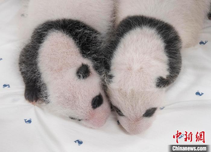 從園方公開的滿月照片來看,這對熊貓寶寶已慢慢開始長胖,在眼睛、耳朵、肩膀、胳膊、腿周圍,大熊貓獨特的黑色斑紋顯現。愛寶樂園大熊貓飼養員宋永寬在近期公開的視頻中介紹,背后像爸爸“樂寶”一樣有V型黑紋的是姐姐,像媽媽“愛寶”一樣有U型紋的是妹妹。