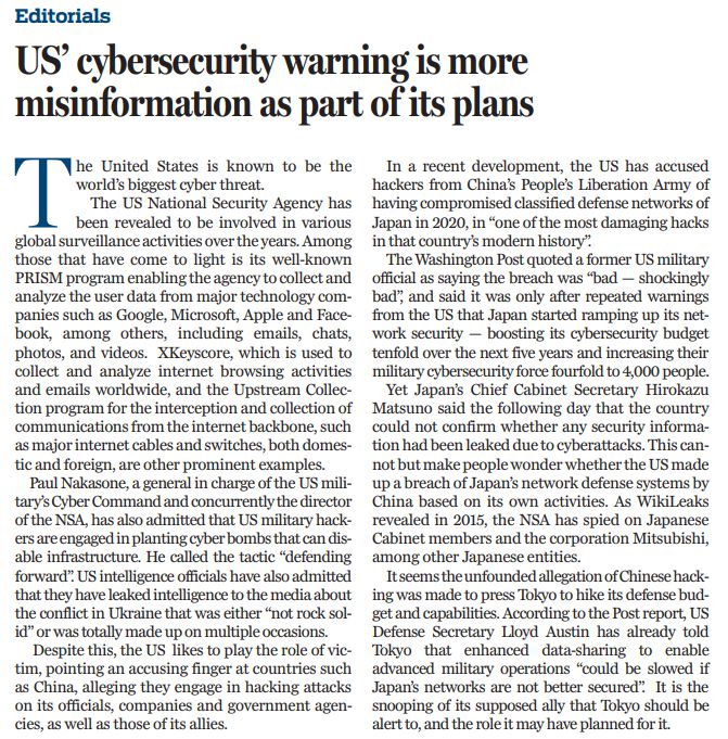 原標題:US' cybersecurity warning is more misinformation as part of its plans