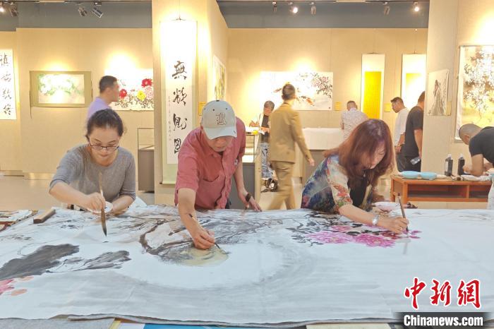 8月9日,張明琴(右一)在福建泉州與藝術家們共繪國畫作品。 吳冠標 攝