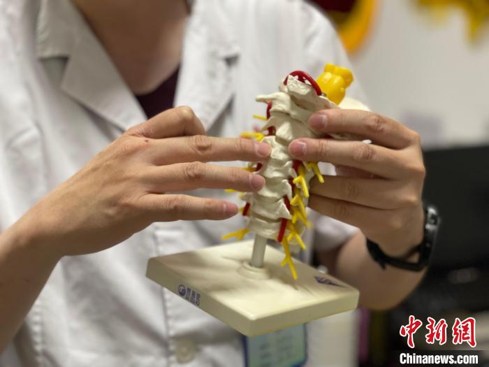 7月10日,閔楷家展示脊柱模型。 徐珊珊 攝