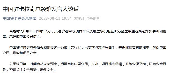 中國駐卡拉奇總領館強烈譴責這一恐怖主義行徑,已要求巴方嚴懲兇手,并采取切實有效措施,確保中國公民、機構和項目安全。