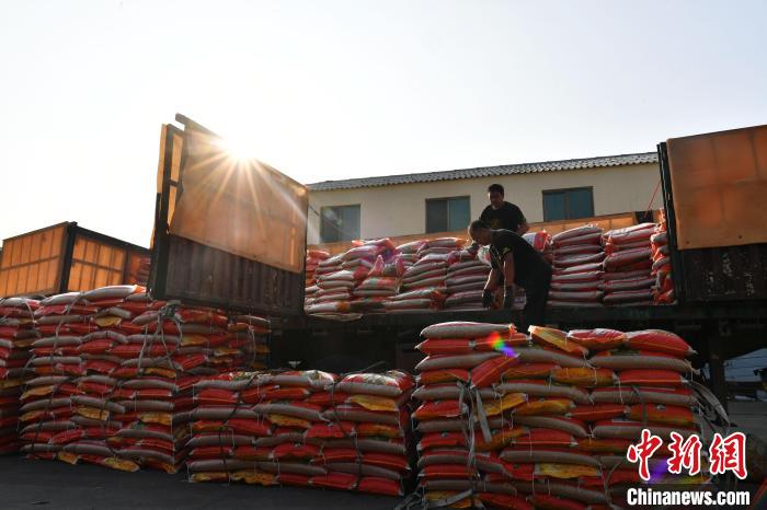 8月15日,河北省涿州市供銷社農資集采集配中心,一輛滿載34噸冬小麥種子的農資配送車輛抵達這里,工人們正在卸車。中新社記者 翟羽佳 攝