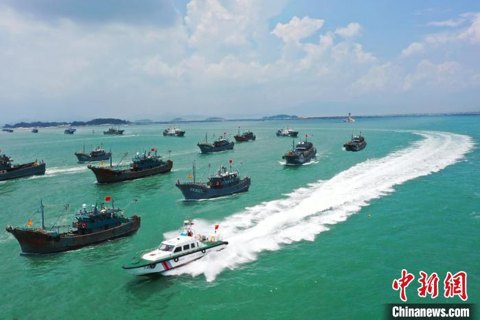 中新網漳州8月16日電(蔡曉曄)16日12時起,北緯26度30分以南的東海結束為期3個半月的伏季休漁期,在福建省漳州市各碼頭,眾多漁船在海警艦艇的護航下有序駛離漁港,千帆競發奔赴不同漁區開展捕撈作業。