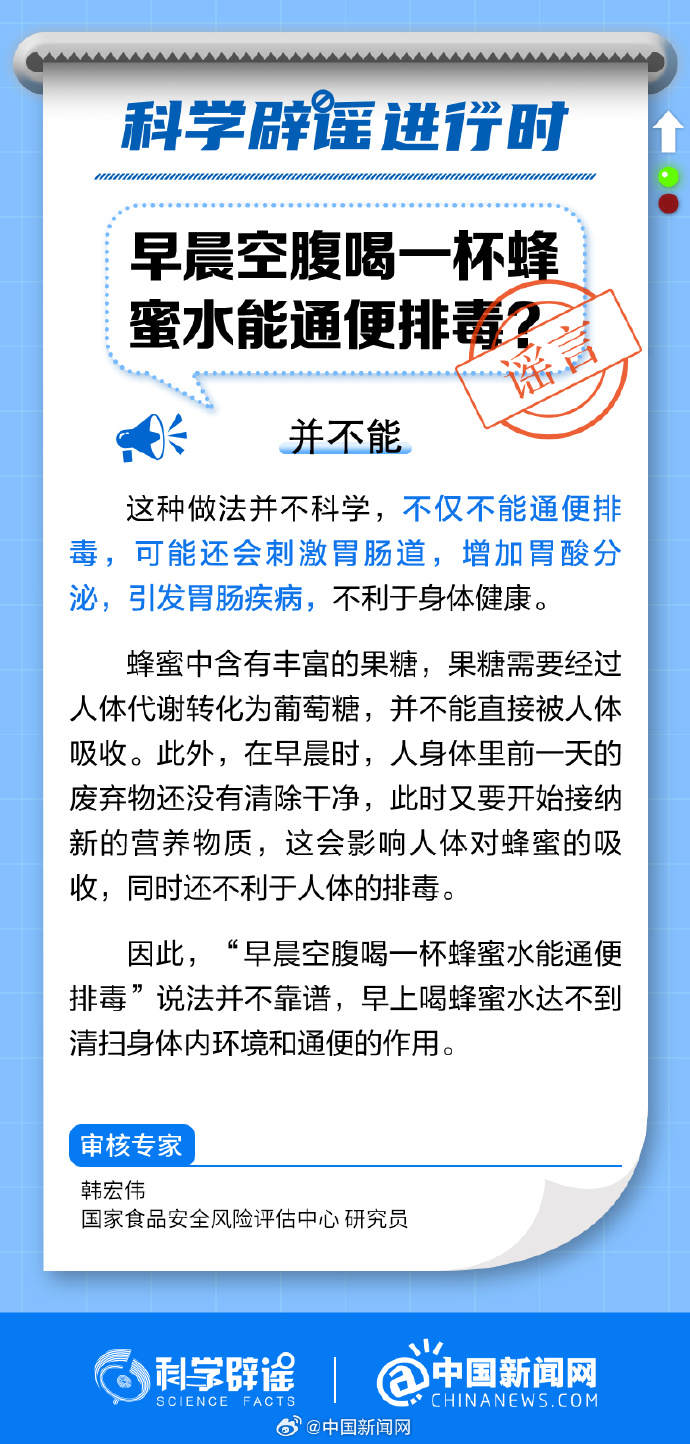 中新網8月22日電 早晨空腹喝蜂蜜水不僅不能通便排毒,可能還會刺激胃腸道,增加胃酸分泌,引發胃腸疾病。蜂蜜中含有豐富的果糖,果糖需要經過人體代謝轉化為葡萄糖,并不能直接被人體吸收。在早晨,人身體里前一天的廢棄物還沒有清除干凈,此時又要開始接納新的營養物質,這會影響人體對蜂蜜的吸收,還不利于人體的排毒。(來源:@科學辟謠 @中國新聞網 )