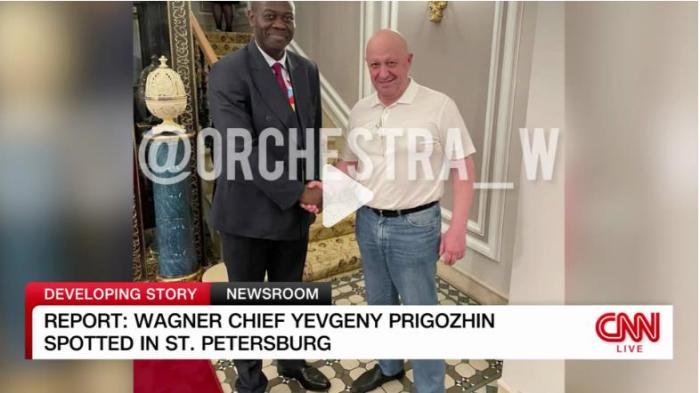 在圣彼得堡舉行的俄非峰會期間,“瓦格納”組織創始人普里戈任被拍到和與會非洲代表握手。(圖片來源:美國有線電視新聞網視頻截圖)