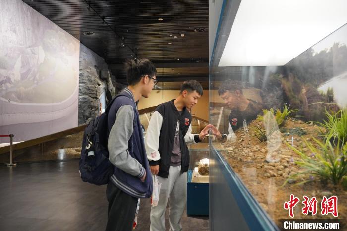 圖為今年5月,游客正在觀賞柳州白蓮洞洞穴科學博物館內展出的螺螄殼化石。韋國政 攝