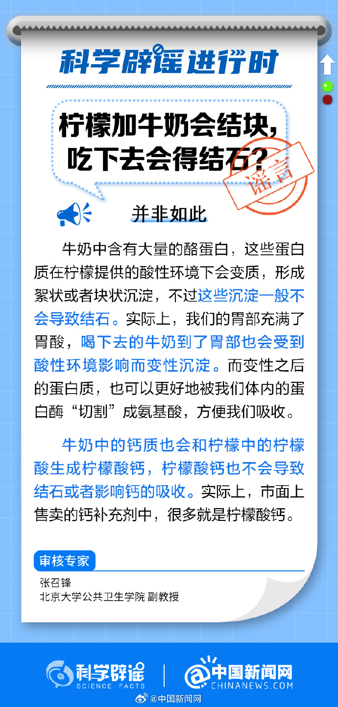 中新網8月29日電 牛奶中含有大量的酪蛋白,這些蛋白質在檸檬提供的酸性環境下會變質,形成絮狀或者塊狀沉淀,不過這些沉淀一般不會導致結石。牛奶中的鈣質也會和檸檬中的檸檬酸生成檸檬酸鈣,檸檬酸鈣也不會導致結石或者影響鈣的吸收。(來源:@科學辟謠 中國新聞網微博)