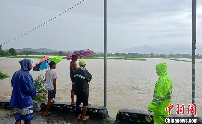 9月3日,菲律賓北部南伊羅戈省圣盧西亞市,當地救災人員在帕拉通社區一座大橋上查看水情。(菲律賓圣盧西亞市警察局 供圖)