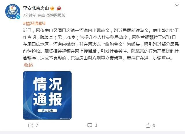中新網(wǎng)9月3日電 3日,北京市公安局房山分局官方微博發(fā)布情況通報稱,近日,網(wǎng)傳房山區(qū)周口店鎮(zhèn)一河道內(nèi)出現(xiàn)碎金,附近居民前往淘金。房山警方經(jīng)工作查明,隗某某(男,26歲)為提升個人社交賬號熱度,網(wǎng)購黃銅顆粒于9月1日在周口店地區(qū)一河道內(nèi)拋撒,并在河邊以“收購黃金”為噱頭,吸引附近部分居民前往撿拾。現(xiàn)場相關(guān)視頻在網(wǎng)上傳播后,引發(fā)社會關(guān)注。隗某某的行為嚴(yán)重擾亂社會秩序,造成不良影響,已被房山警方刑事立案偵查。案件正在進(jìn)一步調(diào)查中。