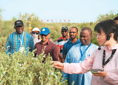 近日,來自非洲的專家在中國新疆參加中非治沙培訓班。圖為在塔克拉瑪干沙漠腹地塔中植物園,中方技術人員向非洲學員介紹荒漠植物。