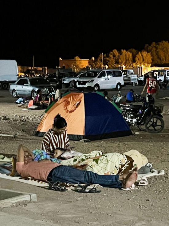 抵達(dá)目的地瓦爾扎扎特,已是9日凌晨1時(shí)左右。記者看到,許多當(dāng)?shù)孛癖娫隈R路上席地而眠。4名結(jié)伴的當(dāng)?shù)厍嗄旮嬖V記者:地震發(fā)生時(shí)大家都很害怕,紛紛來到廣場上,因?yàn)閾?dān)心余震,今晚就打算這樣過夜了。