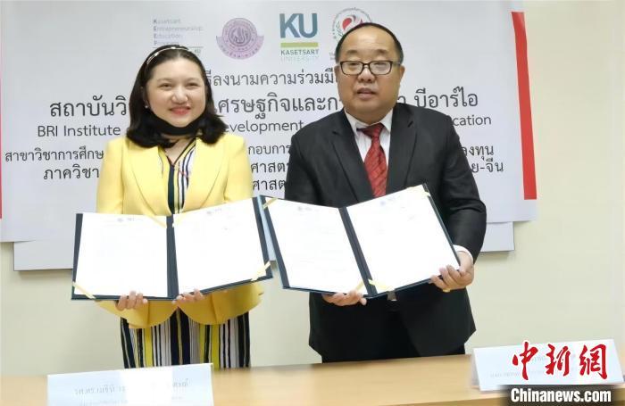 當地時間9日,泰中“一帶一路”投資經貿總商會與泰國國立農業大學簽約,雙方將聯合成立泰國“一帶一路”經濟與教育發展研究院,作為國際經濟發展和教育研究合作組織的智庫。泰中一帶一路投資經貿總商會主席唐隆功·吳森提蘭谷博士(右)與泰國國立農業大學教育學院院長梅蒂尼·拉姆帕卡波博士作為雙方代表簽約。 李映民 攝