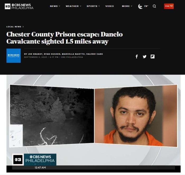 據報道,當地時間8月31日上午8時45分左右,卡瓦爾坎特從賓夕法尼亞州切斯特縣監獄越獄,該地距離費城約有1小時車程。自其越獄后,已多次被監控拍到,也有目擊者見到過他。
