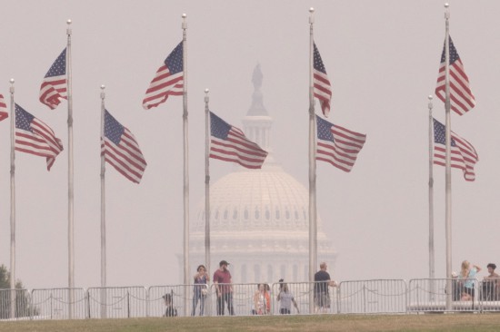 6月29日,在美國首都華盛頓,游客在華盛頓紀念碑游覽,遠處的國會大廈籠罩在煙霧中。新華社發(亞倫攝)