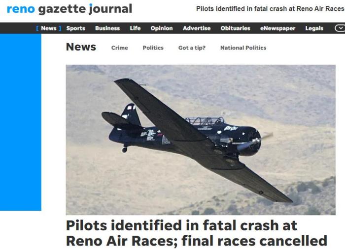 當地媒體雷諾公報(Reno Gazette-Journal)報道稱,遇難的飛行員分別為飛行員克里斯·拉辛和尼克·梅西。據介紹,拉辛是這次比賽的競賽冠軍,名列第一。梅西排名第二。兩名飛行員都來自加州。