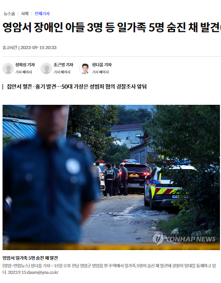 據報道,15日下午3時54分,韓國警察廳接到了關于全羅南道靈巖郡金某住宅窗戶上有血跡的報警。當地警方與消防急救隊一同前往,進入該住宅后發現了金某、金某妻子以及金某夫婦的三名20多歲兒子的尸體。