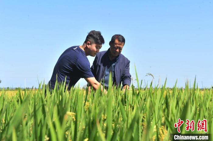 金秋時節,臺胞林駿睿(左)與吉林農民楊萬芳在稻田里觀察水稻。 高龍安 攝