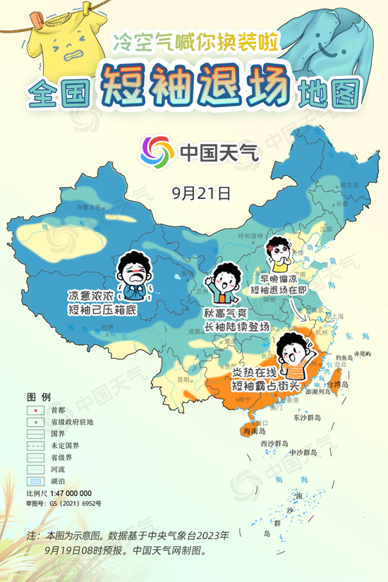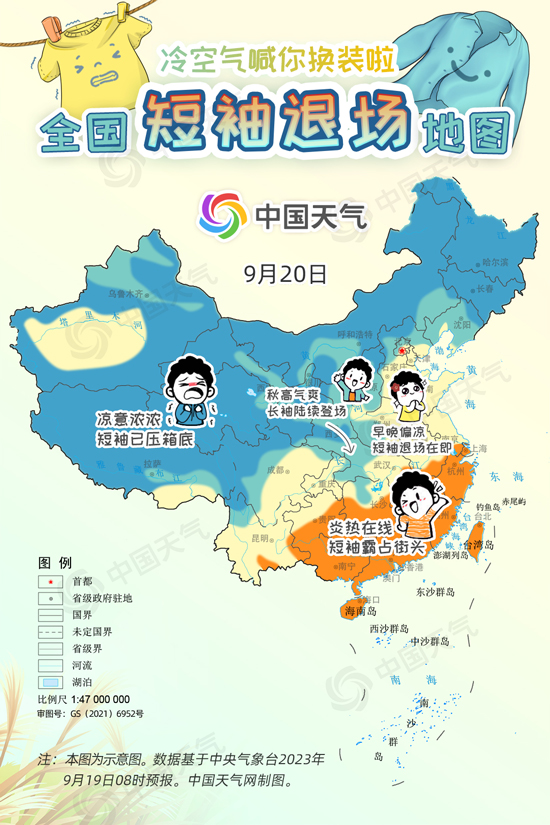 中國天氣網訊 進入9月中旬,冷空氣變“勞模”頻繁來襲,西北、東北大部都已邁入秋天門檻,但華北一帶今年秋天似乎來得有點兒晚,南方地區白天甚至熱到還要開空調,不少網友喊話“秋高氣爽何時能來?”今起三天(9月19日至21日),受冷空氣和降雨共同影響,長江以北大部地區將陸續迎來降溫,開啟秋日初體驗。中國天氣網特別推出全國短袖退場地圖,看看哪里可以安排秋天的第一件長袖。
