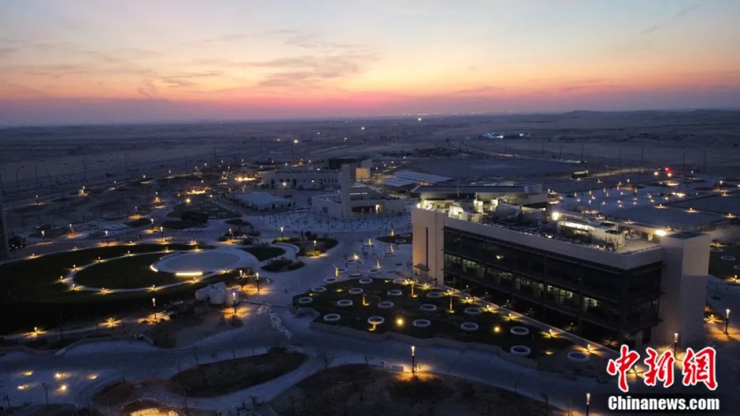 中鐵十八局集團(tuán)承建的沙特薩拉曼國(guó)王能源城項(xiàng)目行政樓、禮堂、醫(yī)院等五棟建筑及附屬工程燈光效果。(2022年11月拍攝)杜林 攝