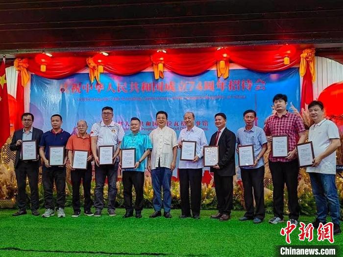 圖為招待會現場舉行領事保護志愿者頒獎儀式。中國駐拉瓦格領事館供圖
