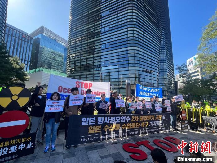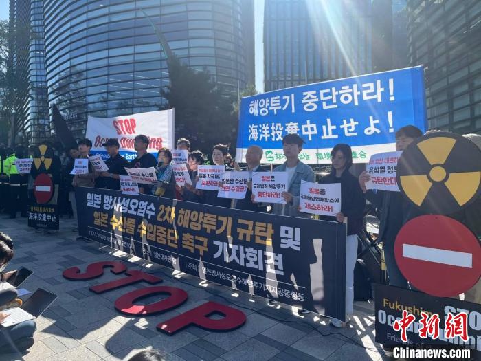中新社首爾10月5日電 (劉旭 金琳)5日上午,韓國市民團體在位于首爾鐘路區的日本駐韓國大使館前舉行記者招待會和集會,譴責日本福島第一核電站核污染水第二輪排海,并敦促韓國政府停止進口日本水產品。