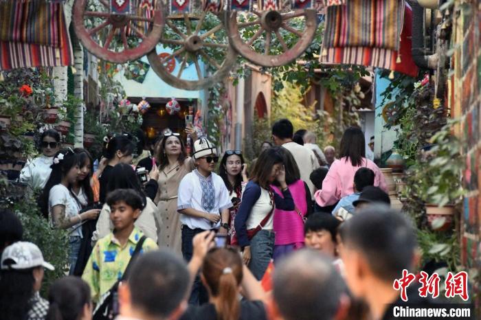 正值中秋國慶假期,位于中國西部的新疆喀什古城景區迎來旅游高峰,成為眾多游客的出行目的地。圖為10月1日,喀什古城景區里絡繹不絕的游客?!≈行戮W記者 孫亭文 攝