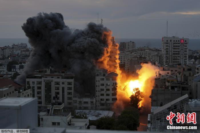 當地時間10月7日,以色列空襲加沙地帶,一座巴勒斯坦公寓大樓爆炸,火球和煙霧上升。