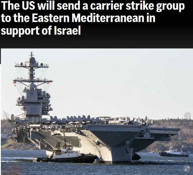 據美聯社報道,當天,美國國防部長奧斯汀發表聲明稱,他下令“杰拉爾德·R·福特”號航空母艦戰斗群移至更靠近以色列的東地中海,包括一艘航空母艦、一艘導彈巡洋艦和四艘導彈驅逐艦,以展示武力,準備應對任何情況,這些情況包括阻止更多武器送達巴勒斯坦伊斯蘭抵抗運動(哈馬斯)以及進行監視。