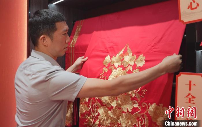8月28日,“臺二代”、湖南富麗真金家紡有限公司總經理杜俊毅在展廳整理產品。 楊世豪 攝
