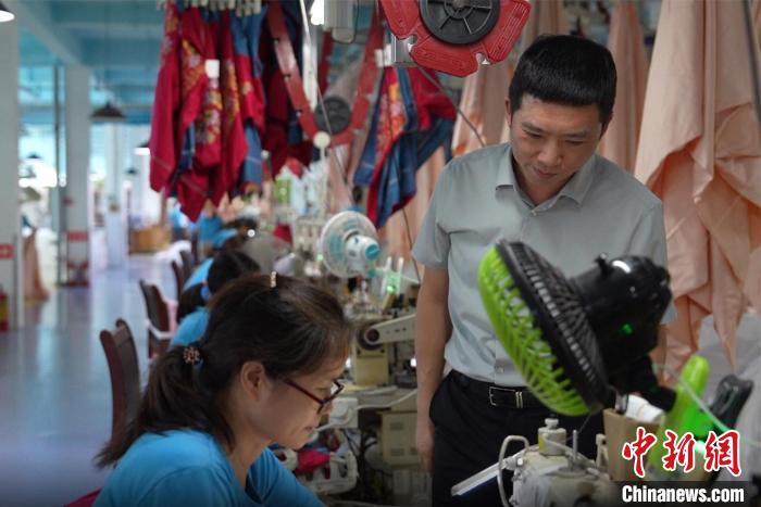 8月28日,“臺二代”、湖南富麗真金家紡有限公司總經理杜俊毅(右)在車間與員工交流。 楊世豪 攝
