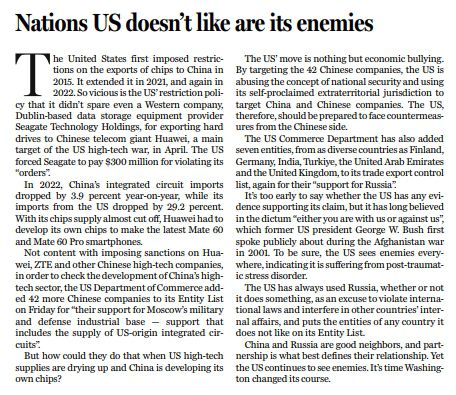 美國的這一做法,是徹頭徹尾的“經濟霸凌”。本次將42家中國企業列入“管制清單”,正是美國泛化其所謂“國家安全”概念,動用其所謂“治外法權”,打壓中國及中國企業的又一實例。這可能會引來中國的反制措施,對此美國應做好準備。