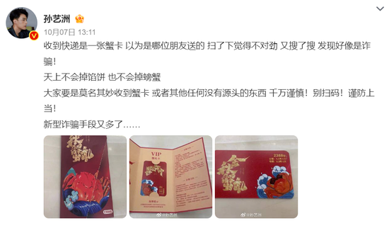 10月7日,知名男演員孫藝洲發文稱,快遞收到一張蟹卡,搜索后發現是詐騙,提醒網友謹防上當。其發文登上熱搜后,不少網友都表示收到過類似蟹卡。