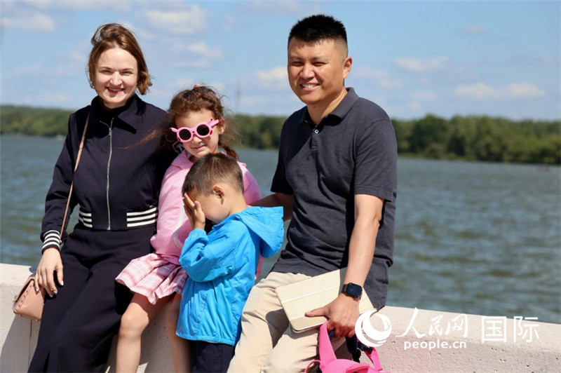 邢亮與妻子娜斯佳還有孩子們在湖邊散步。人民網記者 朱虹攝
