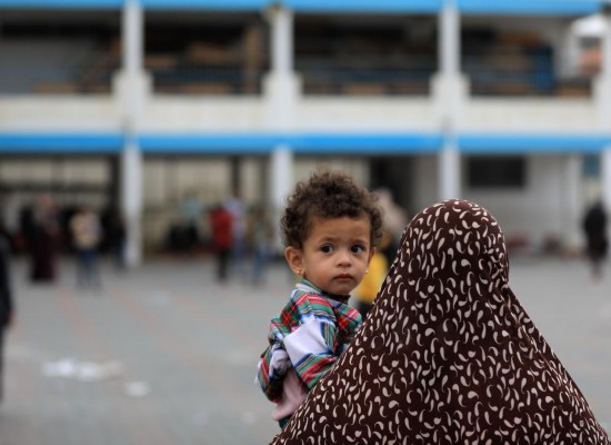 10月9日,一名婦女抱著小孩在加沙地帶南部城市汗尤尼斯的一所學校躲避以色列空襲。新華社發(亞西爾·庫迪攝)