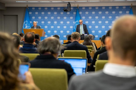 10月9日,在位于紐約的聯合國總部,聯合國秘書長古特雷斯(后左)在記者會上就巴以局勢發表談話。新華社發(聯合國供圖/保羅·菲爾蓋拉斯攝)