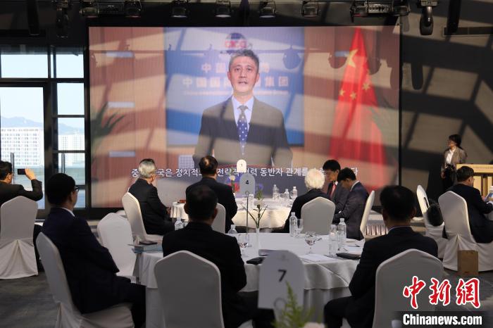 圖為中國外文局副局長兼總編輯高岸明視頻致辭。中新社發 中國駐韓國大使館 供圖