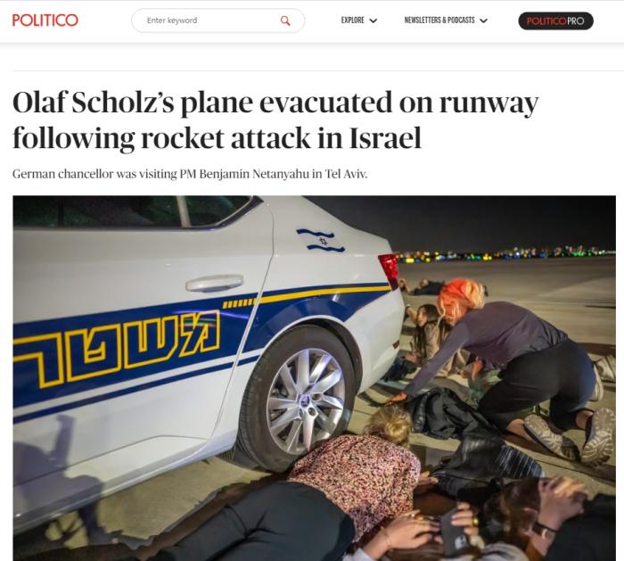 當地時間17日晚,德國總理朔爾茨在以色列本古里安機場登機前突遇火箭彈襲擊,人員緊急躲避。圖片來源:美國政治新聞網報道截圖