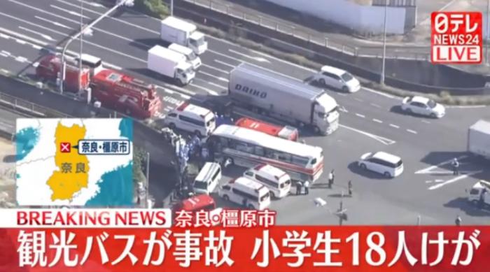 據報道,事發時車內共有34名小學生,另外還有3名教師,一行人原本是計劃前往奈良公園參加遠足活動,但在橿原市一個路口發生車禍。
