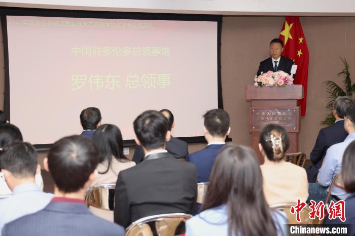 中國駐多倫多總領館10月21日為領區2022年度“國家優秀自費留學生獎學金”獲得者頒獎。圖為中國駐多倫多總領事羅偉東在儀式上致辭。中新社記者 余瑞冬 攝