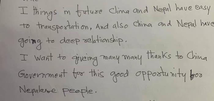 國之交在于民相親,民相親在于心相通。采訪過后,這位老人認認真真地用英文寫下一封信并交給中新網(wǎng)記者。他說:“我相信,未來中尼交通將更加便利,兩國情誼將更加深厚。我非常、非常地感謝中國政府,為尼泊爾人民帶來了這些大好機會。”